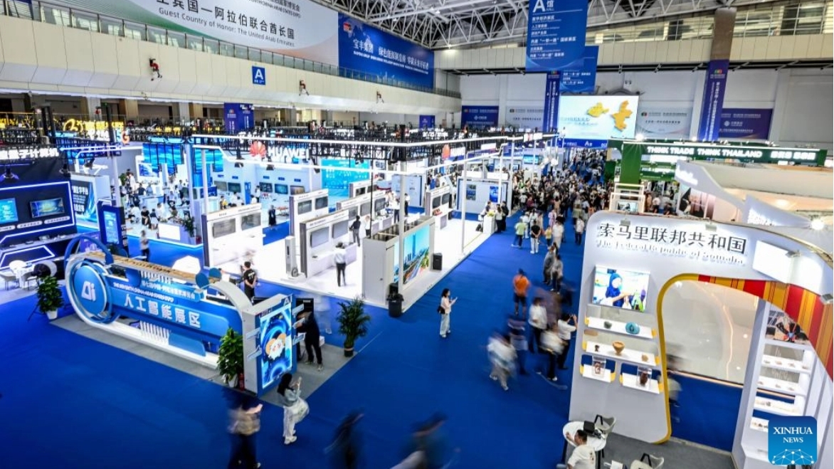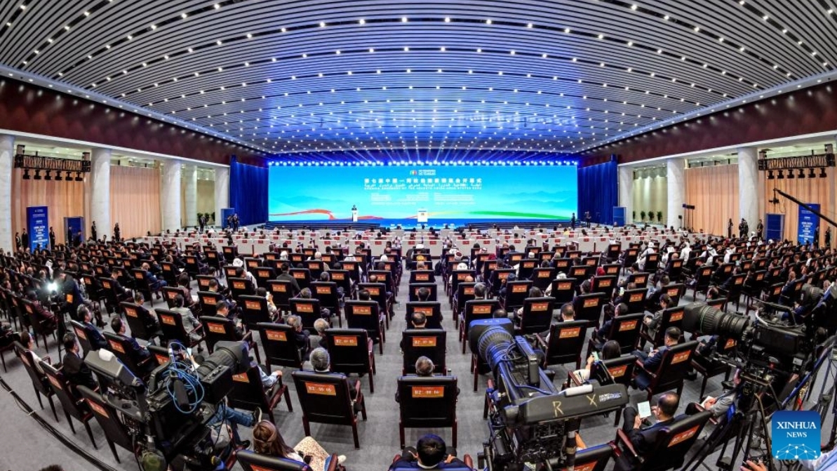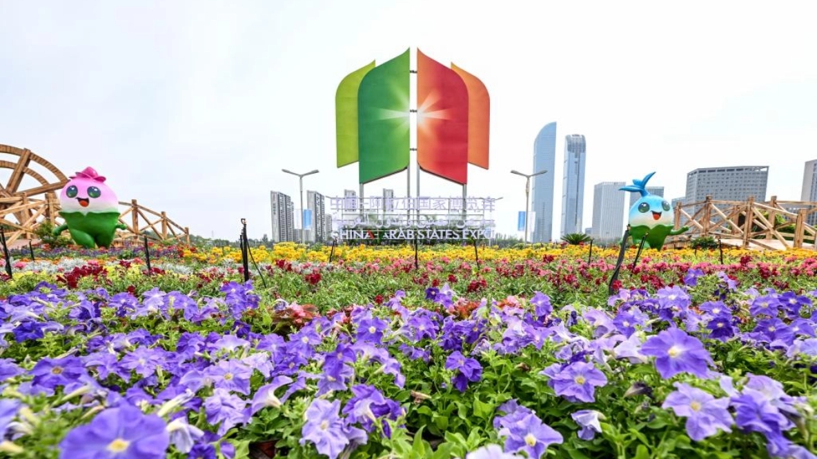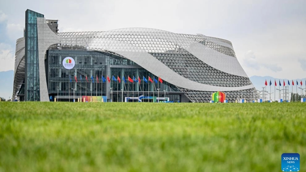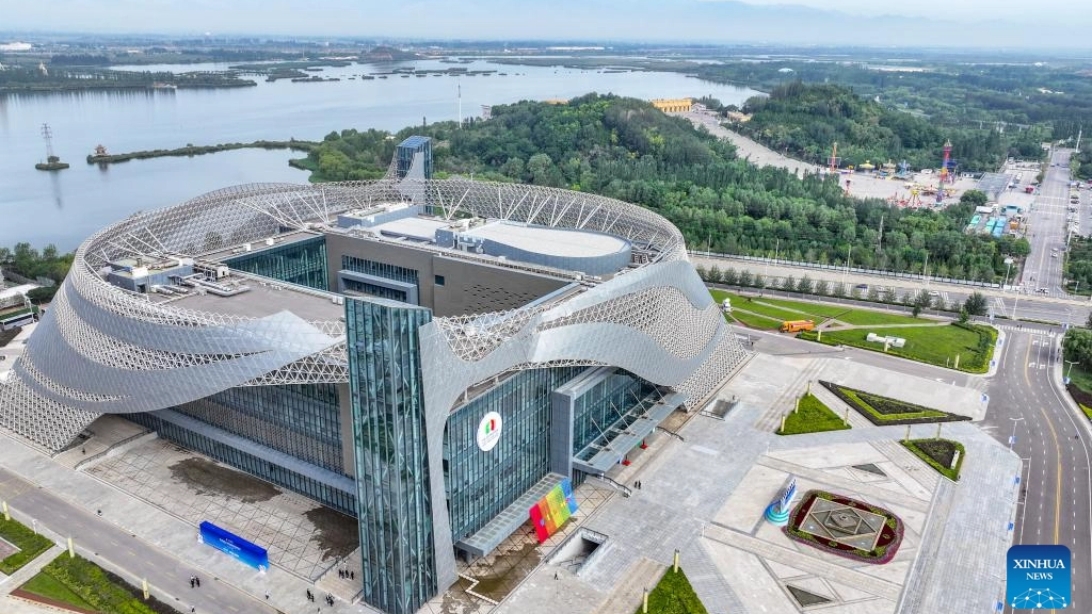 This photo taken on Aug. 28, 2025 shows a view outside the venue of the seventh China-Arab States Expo in Yinchuan, northwest China's Ningxia Hui Autonomous Region. The seventh China-Arab States Expo kicked off on Thursday in Yinchuan, capital of northwest China's Ningxia Hui Autonomous Region, attracting more than 7,600 participants and over 2,200 enterprises and institutions from 75 countries and regions. Themed "Innovation, Green Development and Prosperity," the four-day expo will host trade fairs and forums focused on eight key sectors, including investment, technology transfer and innovation cooperation, modern agriculture, tourism, and intellectual property. The offline exhibition is divided into six sections, showcasing Belt and Road cooperation, regional economic partnerships, central state-owned enterprises, clean energy, the digital economy, and specialty products. (Xinhua/Feng Kaihua)