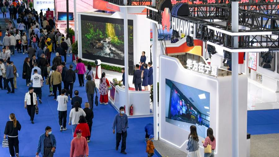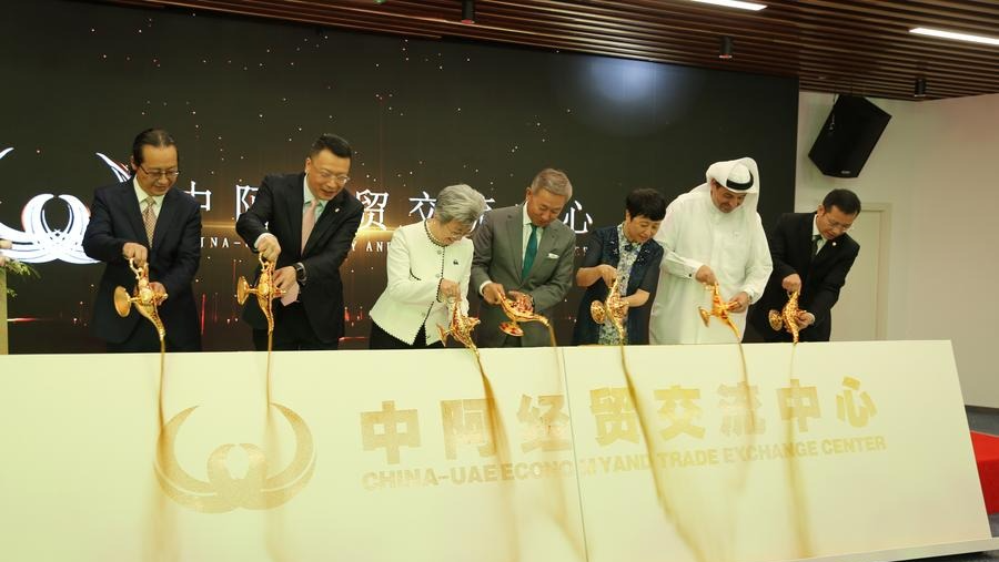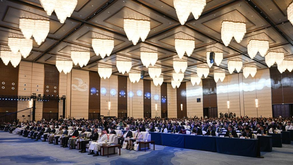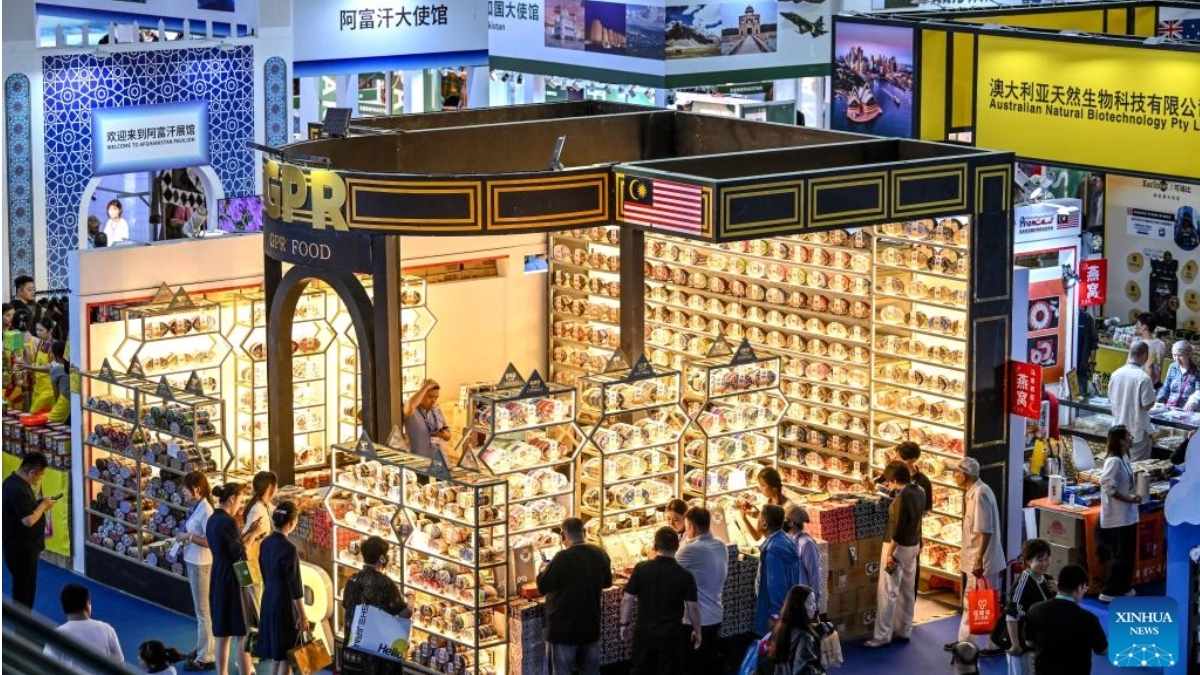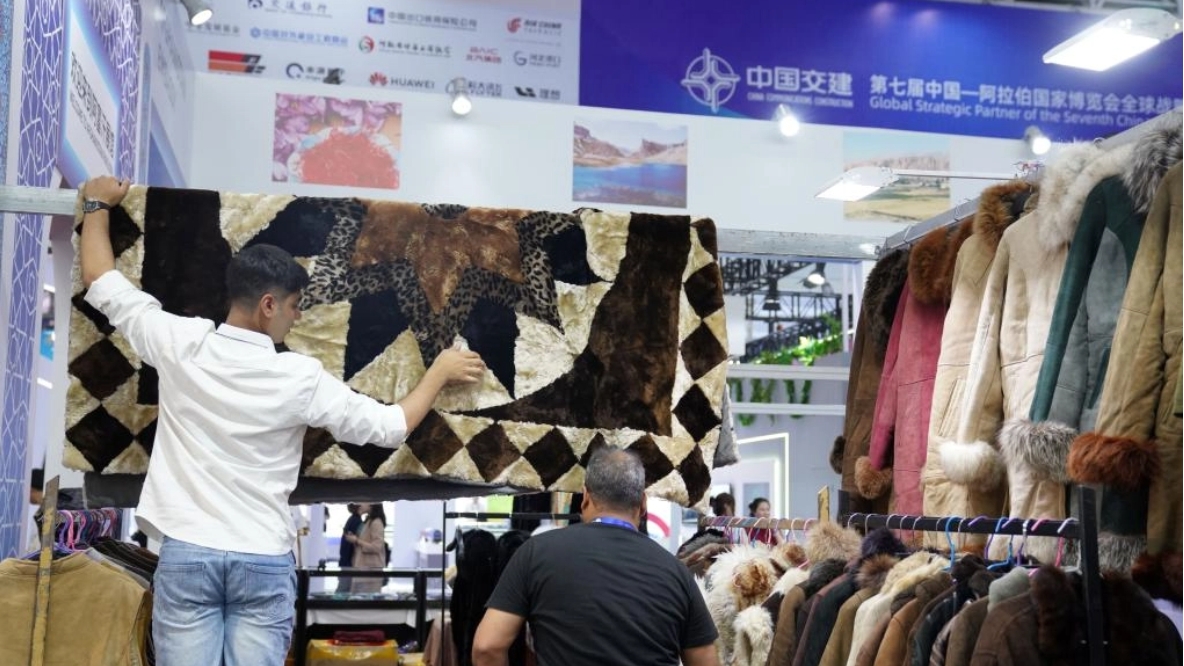 This photo taken on Aug. 28, 2025 shows a view outside the venue of the seventh China-Arab States Expo in Yinchuan, northwest China's Ningxia Hui Autonomous Region. The seventh China-Arab States Expo kicked off on Thursday in Yinchuan, capital of northwest China's Ningxia Hui Autonomous Region, attracting more than 7,600 participants and over 2,200 enterprises and institutions from 75 countries and regions. Themed "Innovation, Green Development and Prosperity," the four-day expo will host trade fairs and forums focused on eight key sectors, including investment, technology transfer and innovation cooperation, modern agriculture, tourism, and intellectual property. The offline exhibition is divided into six sections, showcasing Belt and Road cooperation, regional economic partnerships, central state-owned enterprises, clean energy, the digital economy, and specialty products. (Xinhua/Feng Kaihua)